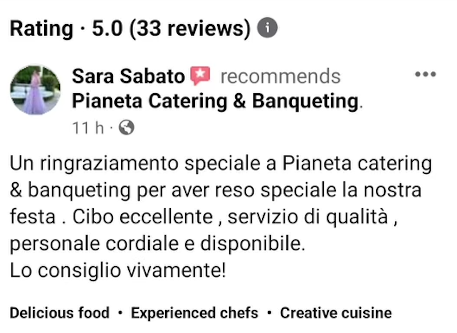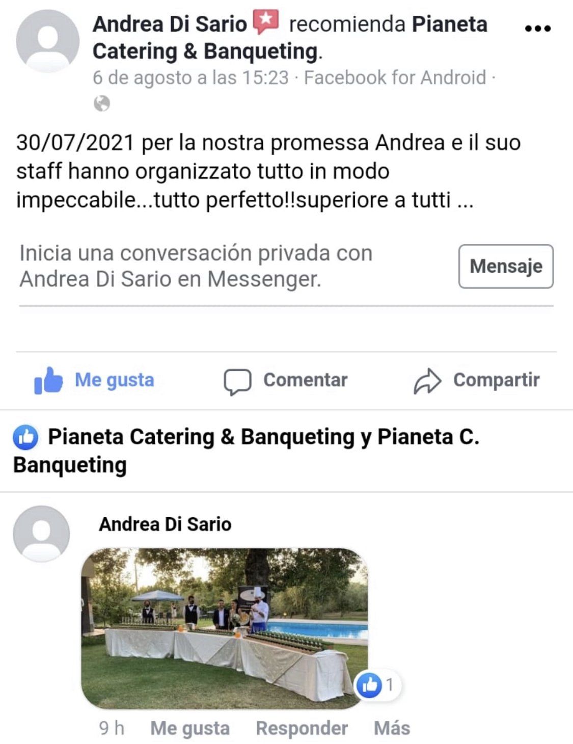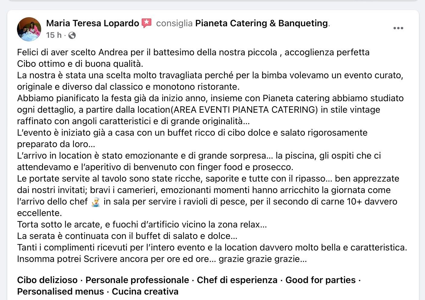 Oggi vi racconto un po’ la storia di Pianeta catering 🍽, dato che tanti ospiti lo chiedono sempre. La mia creatura nasce da una forte passione culinaria🧑🍳🍝🫕 e un grande desiderio di vedere persone e ospiti felici durante un evento🕺👯♀️🕺… Da sempre ho creduto nel mio lavoro👨🍳 e nella vera professionalità, senza mai sminuire o svalorizzare il vero catering per eventi come lo facciamo noi… dando garanzie e certezze ai miei ospiti. L’idea è sempre stata chiara fin dal principio: realizzare eventi come dio comanda! A differenza degli altri ho impostato fin da subito un vero e proprio codice d’onore: -realizziamo solo eventi; -il cibo si trasforma dalla « A » alla « Z » da noi; -usiamo solo tovagliato in stoffa, bicchieri in vetro, posateria in acciaio; -cibo cucinato al momento, direttamente davanti agli ospiti; -catering per eventi completo(tutto ciò che ti serve dalla « A » alla « Z » tavoli, sedie, gazebo, etc…); -garanzia pioggia con il servizio gazebo; -presenza di personale qualificato pronto a coccolare gli ospiti; -…non c'è evento senza divertimento… 🥁🎻🕺 -etc etc etc… perché un codice d’onore? perché il tuo matrimonio deve essere speciale e unico nel suo genere… a differenza degli altri, delle rosticcerie di turno o dei ristoranti che si improvvisano dalla sera alla mattina, noi siamo sempre i 1’ ad aver concepito una creatura così com’è… siamo sempre il 1’ catering per eventi, vero, originale, autentico. Manteniamo i nostri principi per realizzare i tuoi sogni…Button