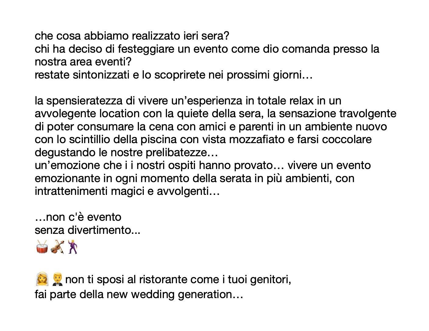 Voglio una festa diversa! Voglio sorprendere tutti i miei invitati! anche tu come tanti ospiti immagino sei ormai stanco della monotonia del ristorante, e si sa rinchiudersi in quattro mura e poi mangiare sempre le stesse cose non è proprio il massimo! Con noi di Pianeta catering è tutto diverso, la tua festa prende tutta un’altra forma… momenti di sorpresa e intrattenimento sono la chiave dei nostri eventi 💃🎊🎉 i nostri menù studiati e meticolosamente preparati da noi 👩🍳, la professionalità e la cura dei dettagli… la location scelta direttamente da te, personalizzando il tuo evento fino a renderlo magico e inimitablie… festeggia come dio comanda, metti il turbo alla tua festa, scegli Pianeta catering… per info e dettagli chiamaci al 📞 389.04.77.737 scrivi a 📨 info@pianetacatering.it …non c'è evento senza divertimento... 🥁🎻🕺 👰♀️🤵♂️non ti sposi al ristorante come i tuoi genitori, fai parte della new wedding generation… #eventisicuri #workinprogress #catering #matrimonidilusso #weddings #solo1cosamafattabene #eventi #areaeventi #pianetacatering #cateringpotenza #cateringvenosa #cateringmatera #cateringmaratea #cateringvaldagri #cateringperville #festaprivata #festeggiareinsicurezza #solocosebuone #servizobanqueting #andreavotta #ricevimentipotenza #cateringdiclasse #cateringcompleto #garanziapioggia #eventocomediocomanda #battesimo #areaeventipianetacateringButton